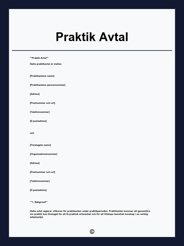 Ladda ner gratis praktik kontrakt för att säkert och enkelt reglera din praktikplats. Perfekt mall för både praktikant och företag, redo att användas och anpassas efter dina behov.