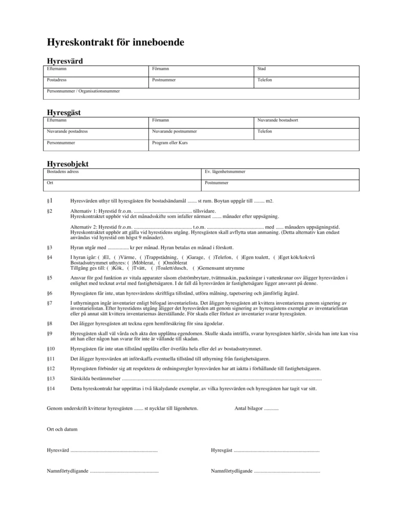 Gratis att ladda ner svenska inneboendekontrakt med hyresvärdsuppgifter, personlig information och kontaktuppgifter. Perfekt för säker och tydlig hyresavtal mellan hyresvärd och inneboende.