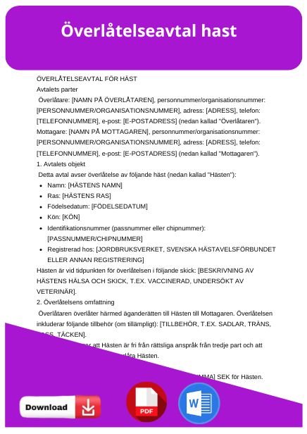Ladda ner gratis ägarbyte häst kontrakt för trygg och enkel överlåtelse av hästägande. Perfekt för att säkerställa tydliga villkor mellan säljare och köpare.