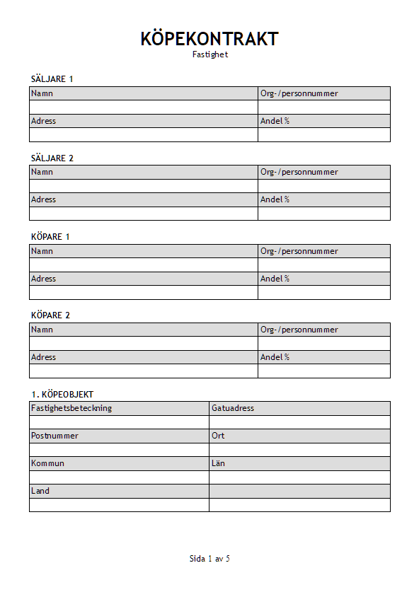 Ladda ner gratis kontrakt för markköp med säljare, köpare, andelar och fullständiga uppgifter. Enkel och säker mall för fastighetsöverlåtelse redo att användas direkt.