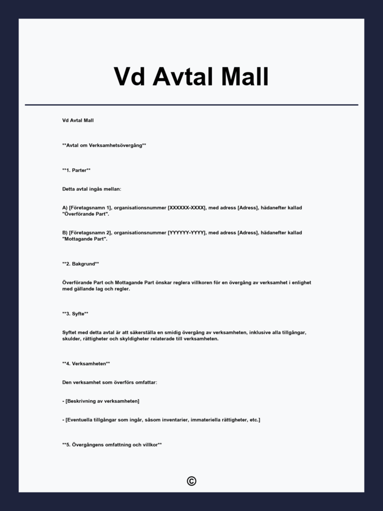 Ladda ner gratis VD-kontraktet för att säkra tydliga villkor i din anställning. Enkel, juridiskt korrekt mall anpassad för företagsledare och verkställande direktörer.