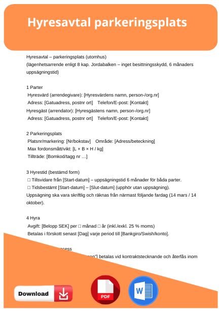 Ladda ner gratis kontraktsmall för parkeringsplats med tydliga villkor om uppsägning tre månader före avtalstidens slut och automatisk kvartalsvis förlängning. Enkelt och tryggt.