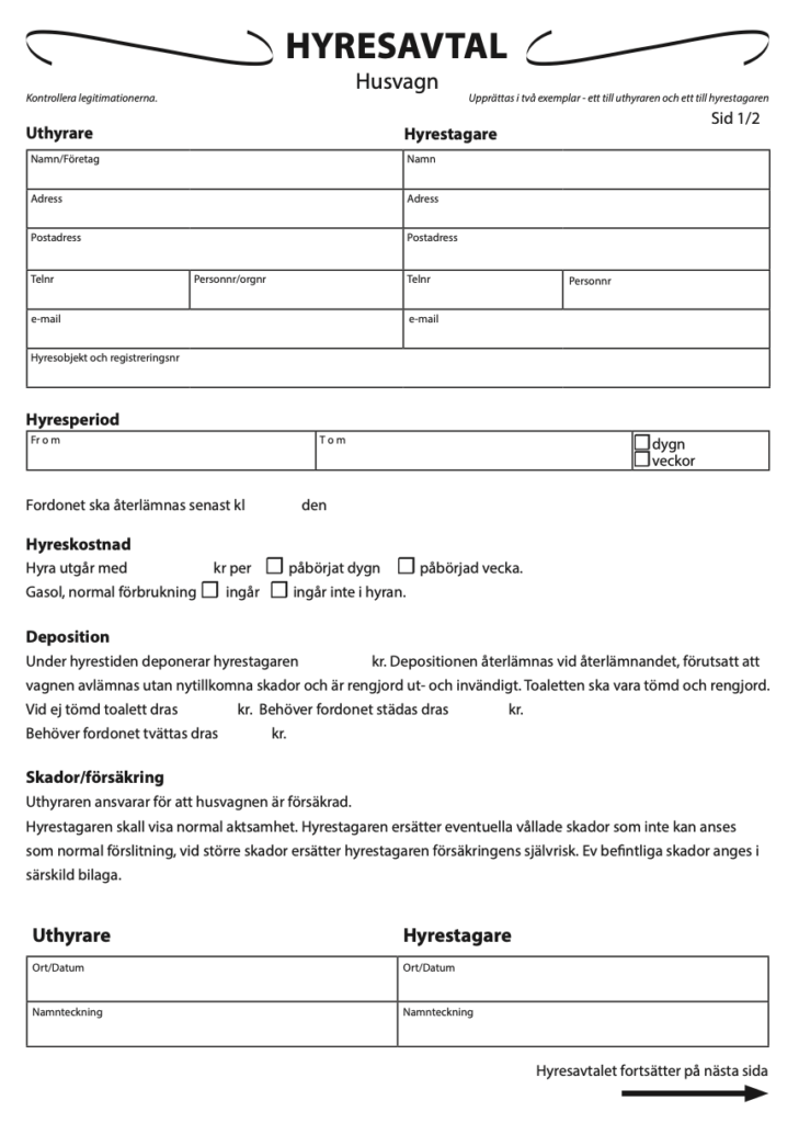 Ladda ner gratis kontrakt för uthyrning av husvagn privat. Enkel och säker mall för att hyra ut din husvagn utan bekymmer. Anpassad för privatpersoner.