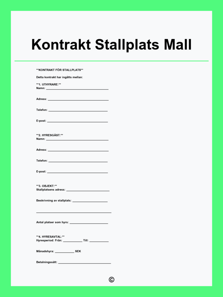 Ladda ner gratis stallplatskontrakt för tydliga villkor om underhåll och ansvar. Säkerställ att anläggningen hålls i gott skick och att tjänster utförs enligt avtal.